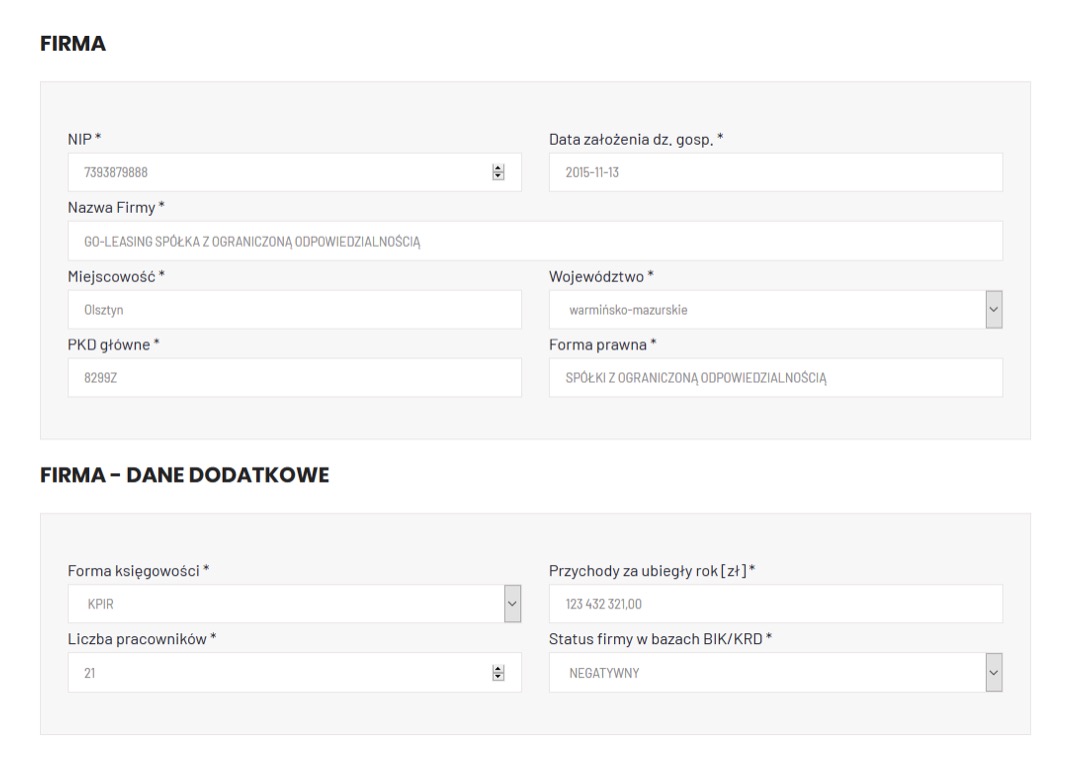 Uzupełnij dane szczegółowe odnośnie przedmiotu leasingu oraz Twojej firmy.